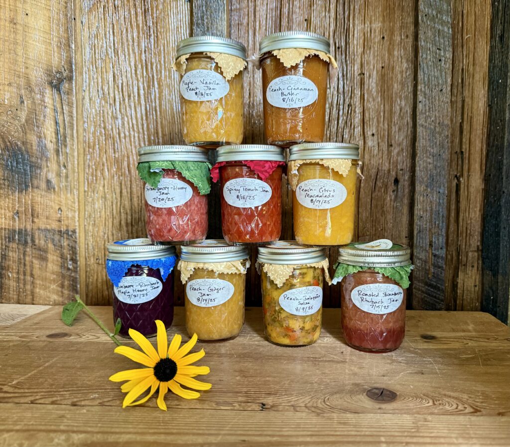 Available flavors include: roasted strawberry-rhubarb jam, strawberry-honey jam, sour cherry jam, blueberry-rhubarb-maple-honey jam, blueberry-honey-lemon jam, peach-ginger jam, maple-vanilla-peach jam, peach-citrus marmalade, peach-cinnamon butter, spicy tomato jam, tomato-basil jam, and peach-jalapeno salsa. More flavors are to come: roasted peach-cardamom jam and roasted strawberry-balsamic jam. Toward the holiday season, we will turn our attention to making Christmas jam.