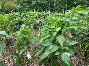 Jimmy Nardello Pepper plants at the Eric Waller Community Garden. The plant on the right was planted with pellets, and the plant on the left was planted without.